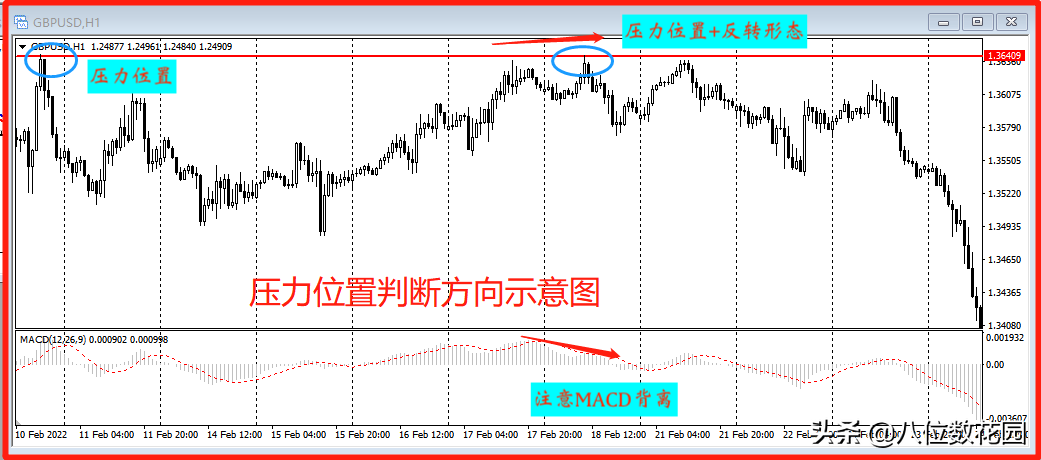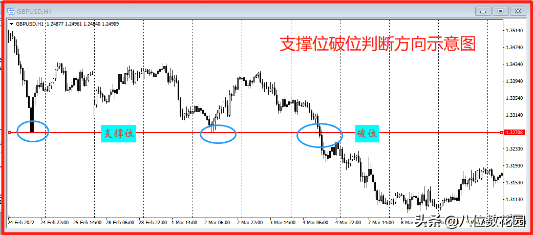 图中是价格测试到压力位置判断方向的示意图,图中是英镑兑美元1小时级别的k线。 价格向上测试到前方的压力位之后,并形成了一个反转的k线形态,此时可以判断方向为空头,之后行情经过震荡整理之后,快速大幅下跌。 注意:图中价格向上测试压力形成反转形态的同时,MACD也处于一个顶部背离的结构,形成共振。 第5种方法:用支撑压力破位判断方向。 这是一种顺势的交易逻辑,价格突破支撑或压力位之后,确实会延续之前的方向继续运行,此时可以判断方向。 价格突破了上方的压力,行情判断为多头,价格突破了下方的支撑,行情判断为空头。 大家看下方的示意图: