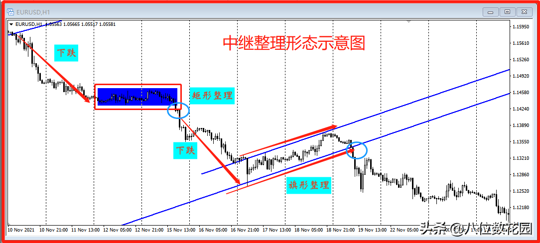 图中左侧是双底形态的示意图。行情经过了底部整理之后,突破了上方的颈线,此时将方向判断为多头。 图中右侧是头肩顶形态的示意图。行情经过了复杂的头部整理之后,突破了下方的颈线,此时将方向判断为空头。 注意左侧:双底形成破位之前,MACD能量柱和k线处于底部背离的状态。顶部底部整理破位的形态,可以同MACD或RSI的顶底背离结合使用。 第7种方法:用整理的中继形态来判断方向。 中继形态属于顺势的交易逻辑,价格突破中继形态整理的颈线之后,延续之前的走势,此时可以判断方向。 向上突破中继形态,将方向判断为多头,向下突破中继形态,将方向判断为空头。 大家看示意图: