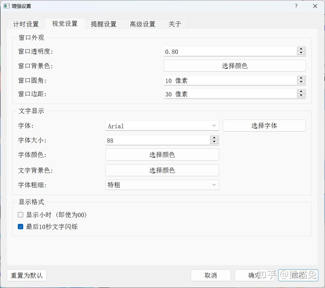 调节窗口透明度、背景色, 设置字体大小与颜色, 开启最后10秒闪烁提醒功能。