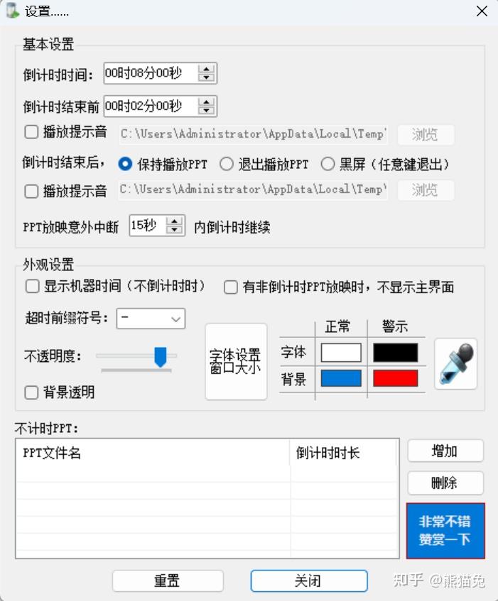 需要注意的是,这款工具不会自动启动倒计时,需要右键手动点击【开始】。时间结束后会自动关闭PPT,非常适合需要严格控制发言时长的场合。