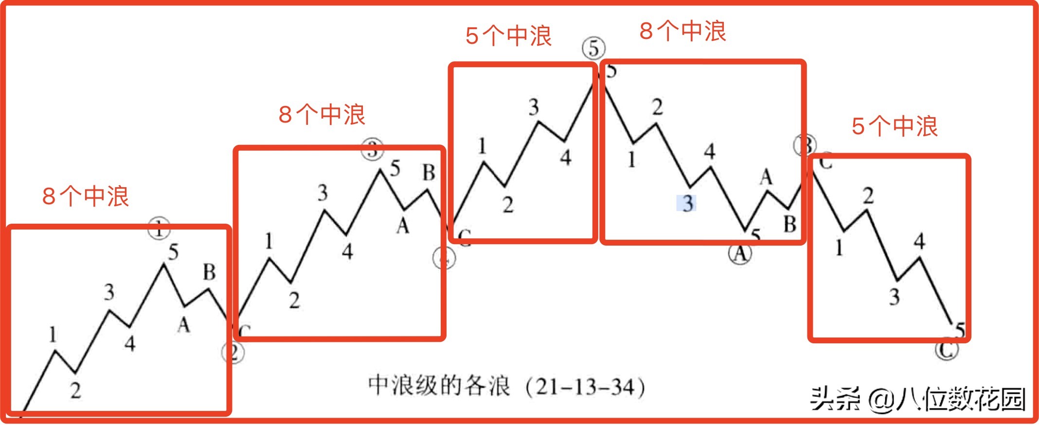 从大浪级别中,又可以把每个大浪细分成中浪,8+8+5+8+5=34个中浪。