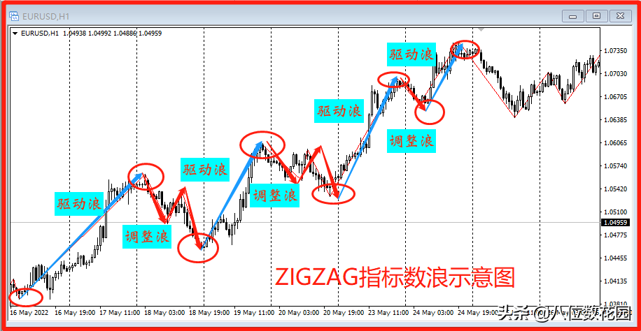 在图表上加载ZigZag指标之后,就可以自动识别行情的高低点。指标连接的高低点,就可以自动读取为1个浪,图中蓝色向上的箭头是驱动浪,红色回调的箭头是整理浪,非常清晰明了。